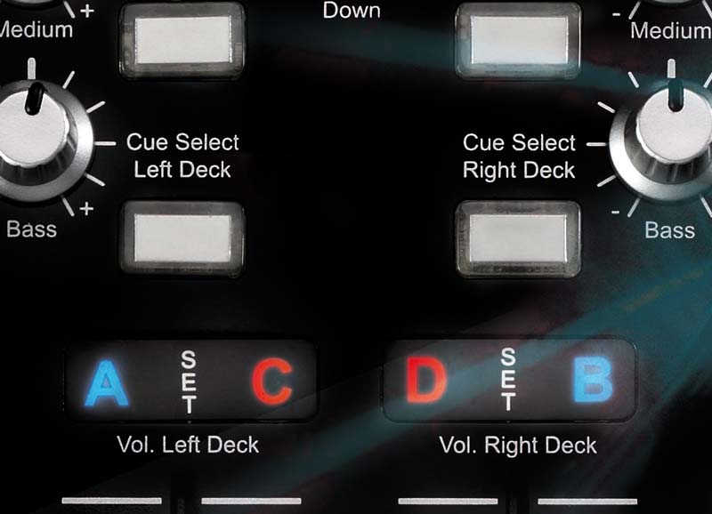 2 deck controls plus 2 deck switches convert deck A into C, and deck B into D, letting you control 4 virtual decks. Deck switches convert all deck controls into another set of MIDI commands, plus mixer volume and EQ controls. Deck viewers light up the letter of the controlled deck, while the backlighting color of jog wheels changes to indicate which virtual deck is being controlled.